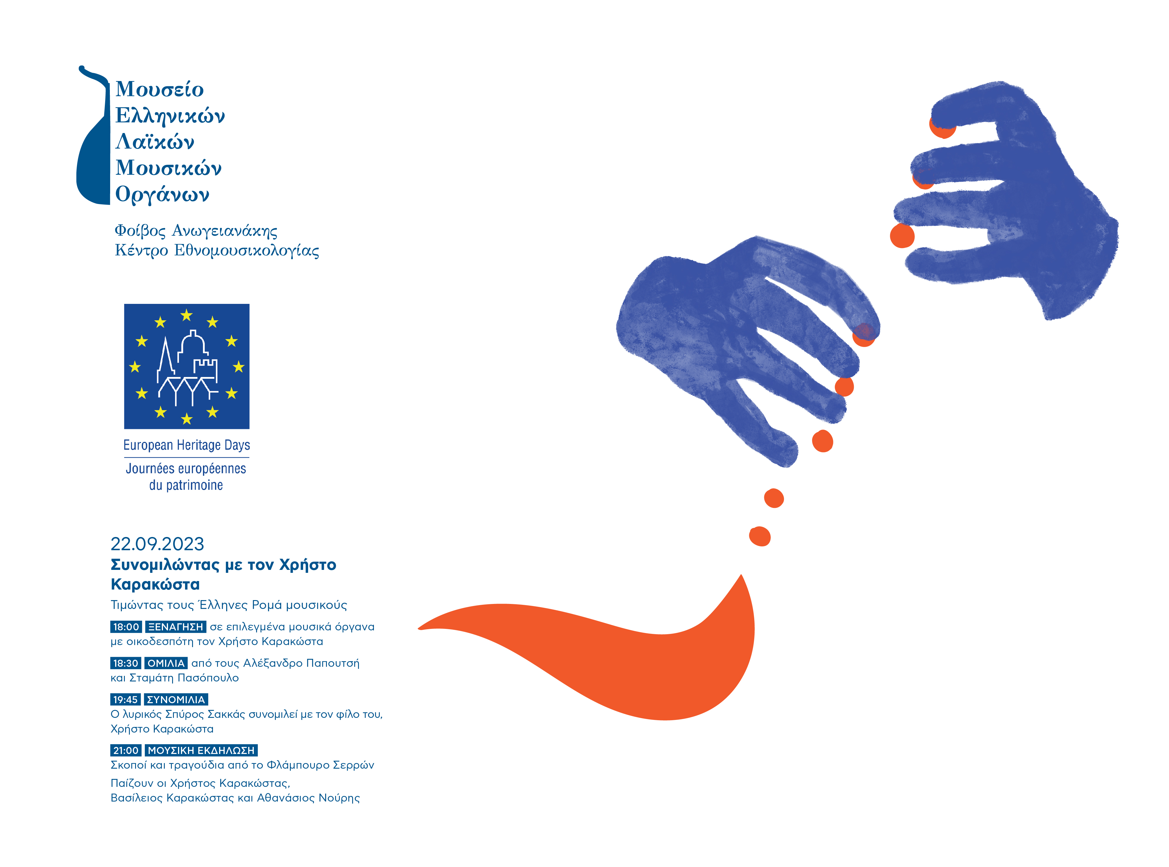 Το Μουσείο συμμετέχει στον εορτασμό των Ευρωπαϊκών Ημερών Πολιτιστικής Κληρονομιάς 2023 με θέμα «Πολιτιστική Κληρονομιά και Παράδοση. Μαρτυρίες του Χθες στο Σήμερα» με ένα διήμερο αφιέρωμα, στις 22 και 23.09.23, στους Έλληνες Ρομά μουσικούς και στο ρόλο της μουσικής στη διαμόρφωση της κοινωνικής τους ταυτότητας.