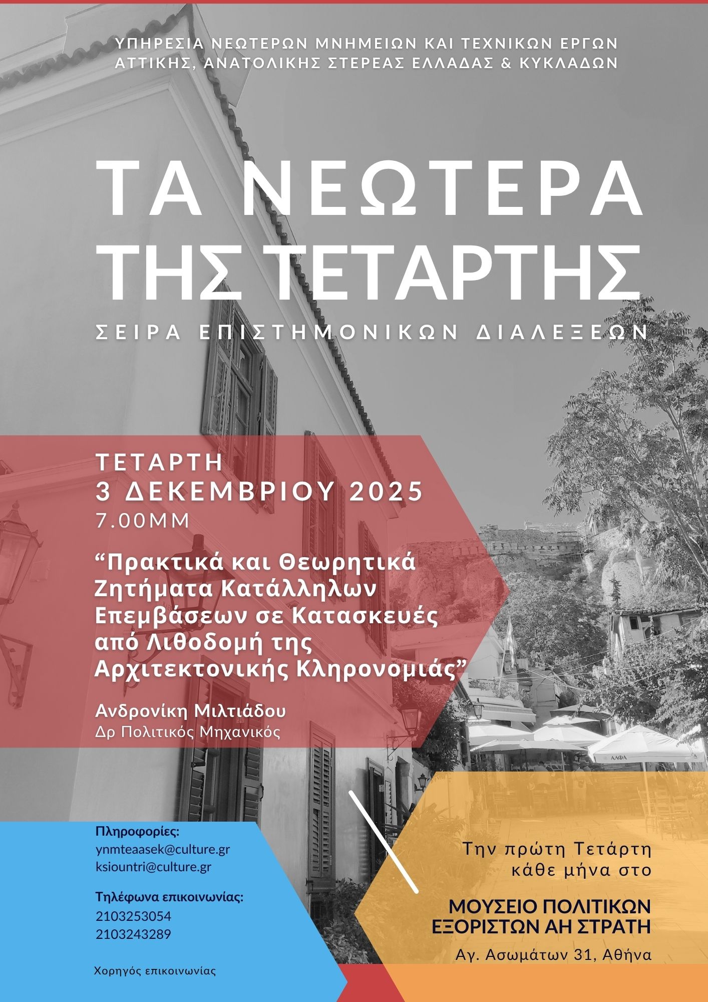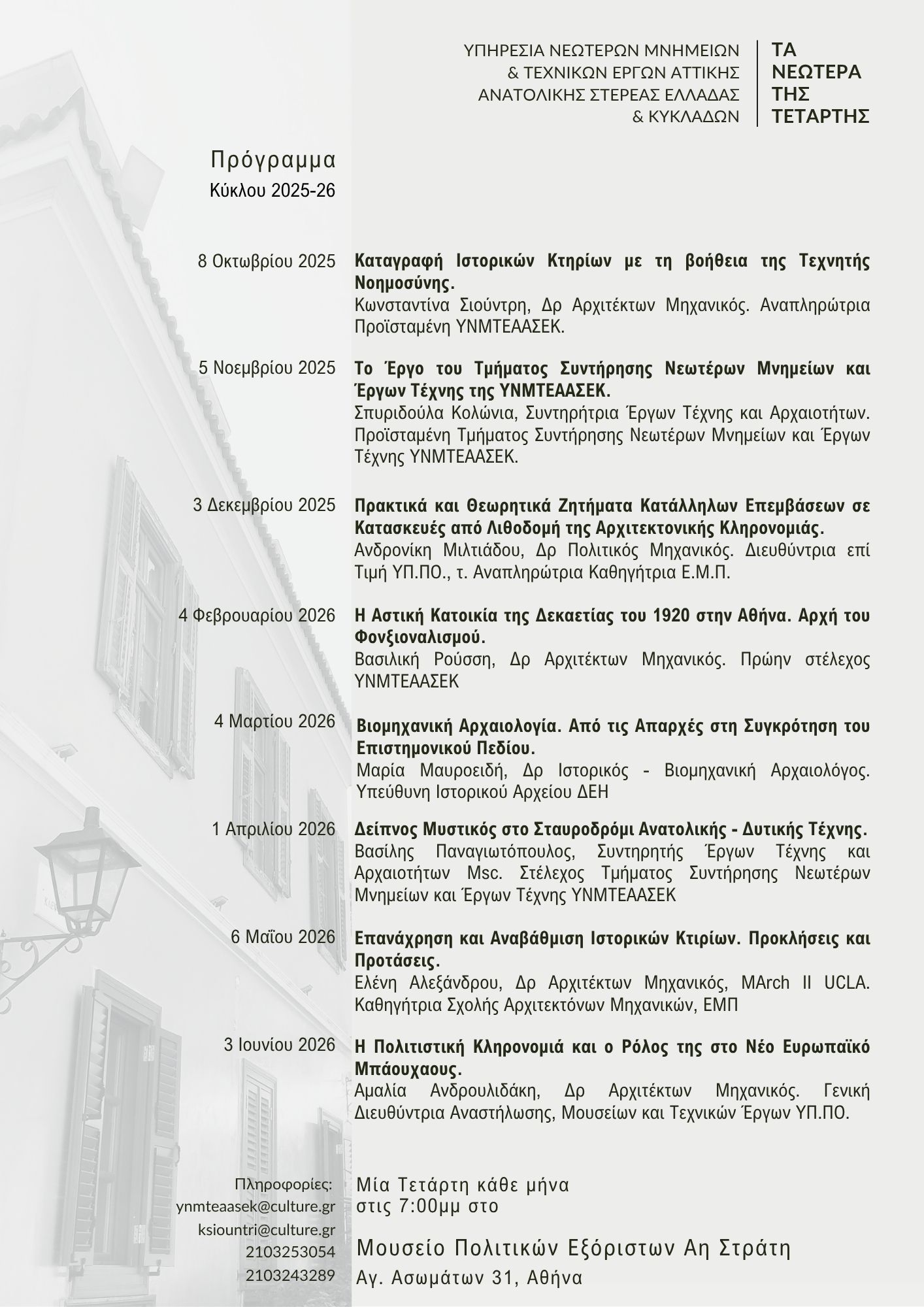 Η Υπηρεσία Νεωτέρων Μνημείων και Τεχνικών Έργων Αττικής, Ανατολικής Στερεάς Ελλάδας και Κυκλάδων, στο πλαίσιο της αποστολής της για την προστασία και ανάδειξη της νεώτερης πολιτιστικής κληρονομιάς σχεδίασε και διοργανώνει μία σειρά επιστημονικών και ενημερωτικών διαλέξεων με τίτλο, «Τα Νεώτερα της Τετάρτης».