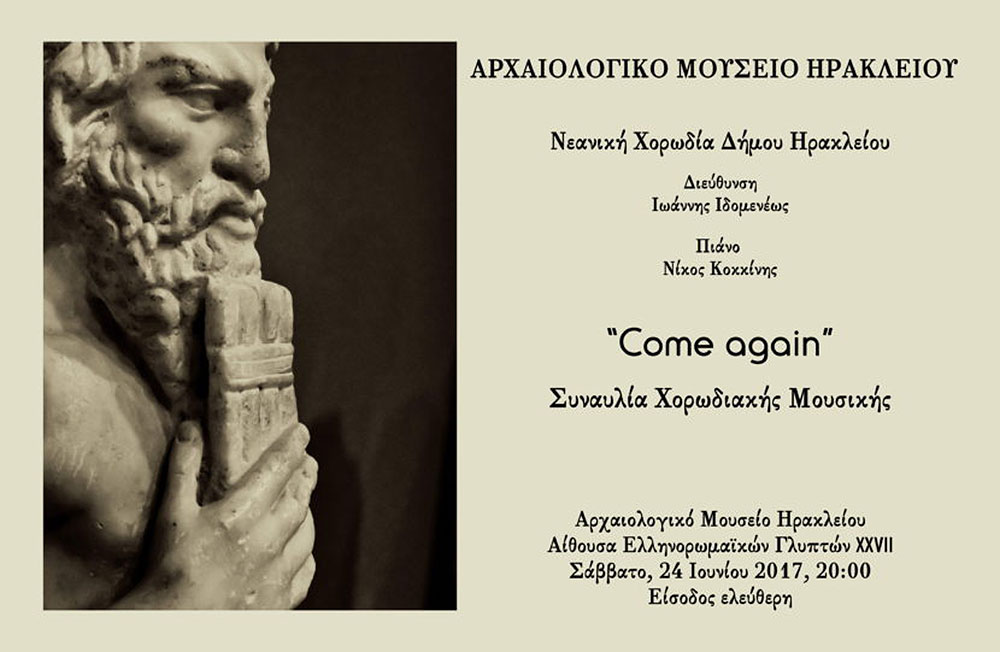 Το Αρχαιολογικό Μουσείο Ηρακλείου σας προσκαλεί στη συναυλία χορωδιακής μουσικής της Νεανικής Χορωδίας του Δήμου Ηρακλείου, που θα γίνει σε εκθεσιακό του χώρο το ερχόμενο Σάββατο. Το καταξιωμένο φωνητικό σύνολο της πόλης του Ηρακλείου θα μας παρουσιάσει ένα σύνολο κομματιών, σε χορωδιακή επεξεργασία, που καλύπτουν ένα ευρύ φάσμα ηχοχρωμάτων από την αγγλική αναγέννηση μέχρι τον ονειρικό κόσμο της ραδιοφωνικής Λιλιπούπολης. Με τον χαρακτηριστικό τίτλο “Come again” η Νεανική Χορωδία του Δήμου Ηρακλείου σηματοδοτεί την επιστροφή της σε ένα γνώριμο χώρο του Μουσείου, στην αίθουσα των ελληνορωμαϊκών γλυπτών, προσκαλώντας μας σε μία εκ νέου συνομιλία με τα μαρμάρινα αγάλματα.