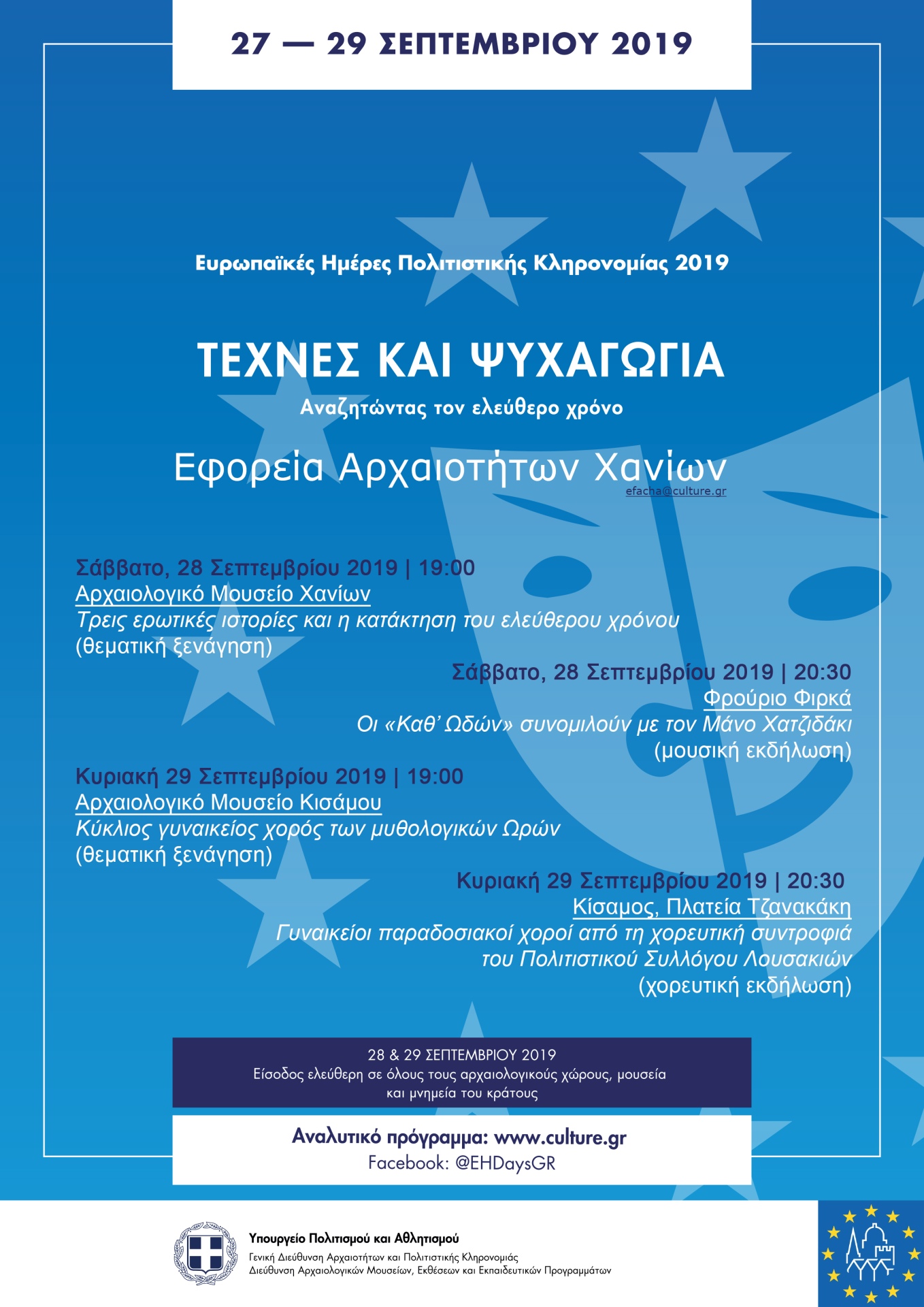 Στο πλαίσιο του εορτασμού για τις Ευρωπαϊκές Ημέρες Πολιτιστικής Κληρονομιάς, με θέμα για το 2019 «Τέχνες και Ψυχαγωγία. Αναζητώντας τον ελεύθερο χρόνο», η Εφορεία Αρχαιοτήτων Χανίων πραγματοποιεί δύο θεματικές ξεναγήσεις στα Αρχαιολογικά Μουσεία Χανίων και Κισάμου. Οι ξεναγήσεις αυτές, εστιασμένες σε ψηφιδωτά δάπεδα που εκτίθενται στα δύο Μουσεία και πλαισιωμένες από μουσικοχορευτικά δρώμενα και δραματοποιημένες αφηγήσεις, αποσκοπούν να ταξιδέψουν τους συμμετέχοντες στη ρωμαϊκή εποχή.