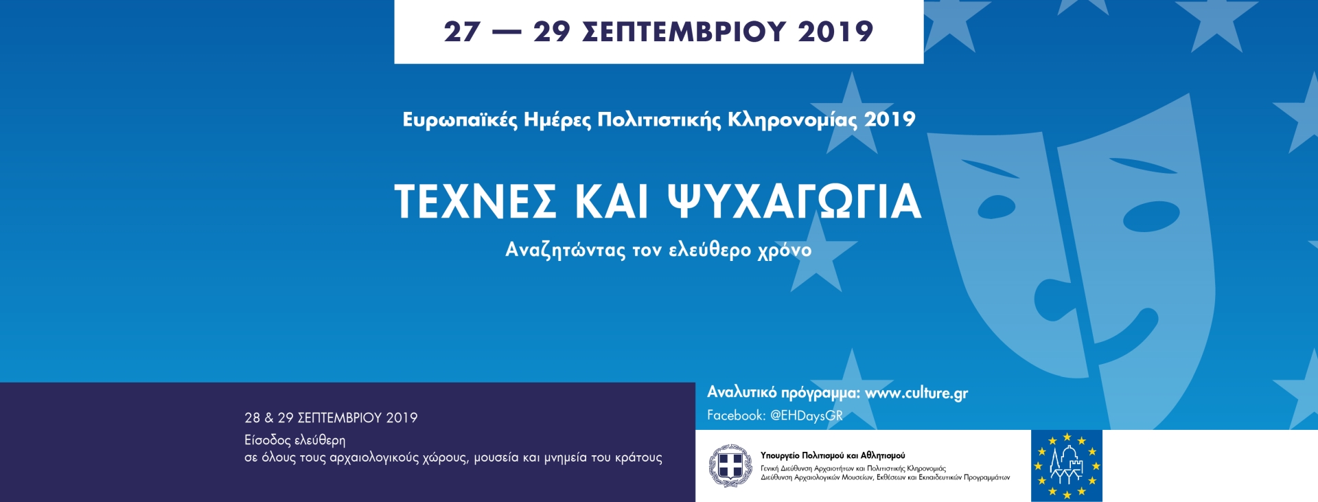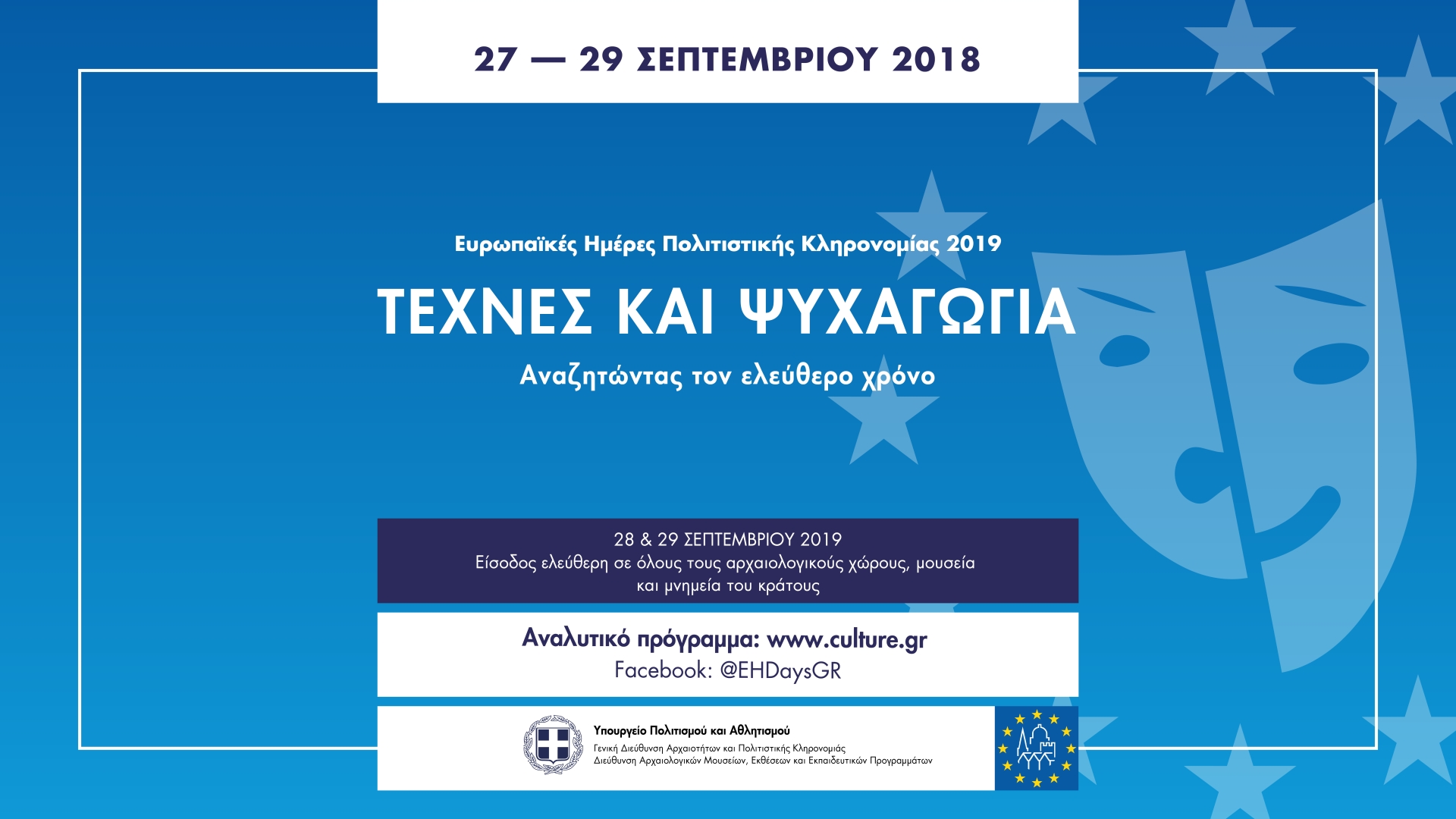 ​Στις 27-29 Σεπτεμβρίου 2019, το Υπουργείο Πολιτισμού και Αθλητισμού γιορτάζει για 23η χρονιά τις Ευρωπαϊκές Ημέρες Πολιτιστικής Κληρονομιάς. «Τέχνες και Ψυχαγωγία. Αναζητώντας τον ελεύθερο χρόνο» είναι το κοινό θέμα σε όλη την Ευρώπη.