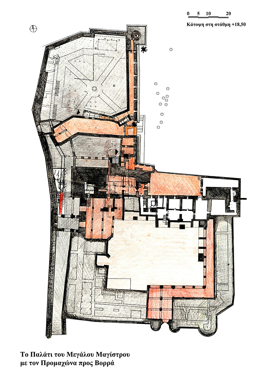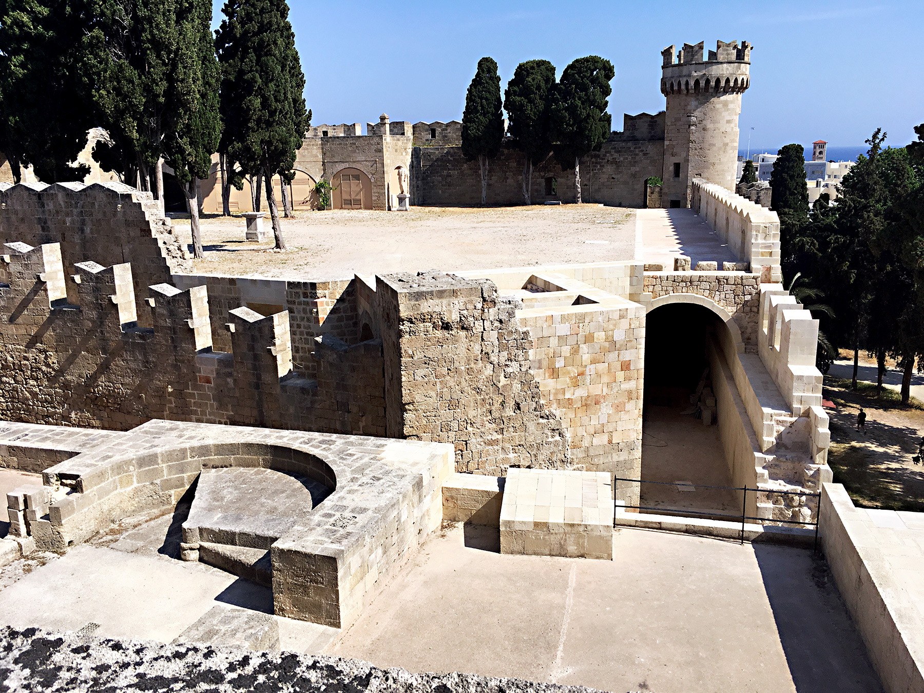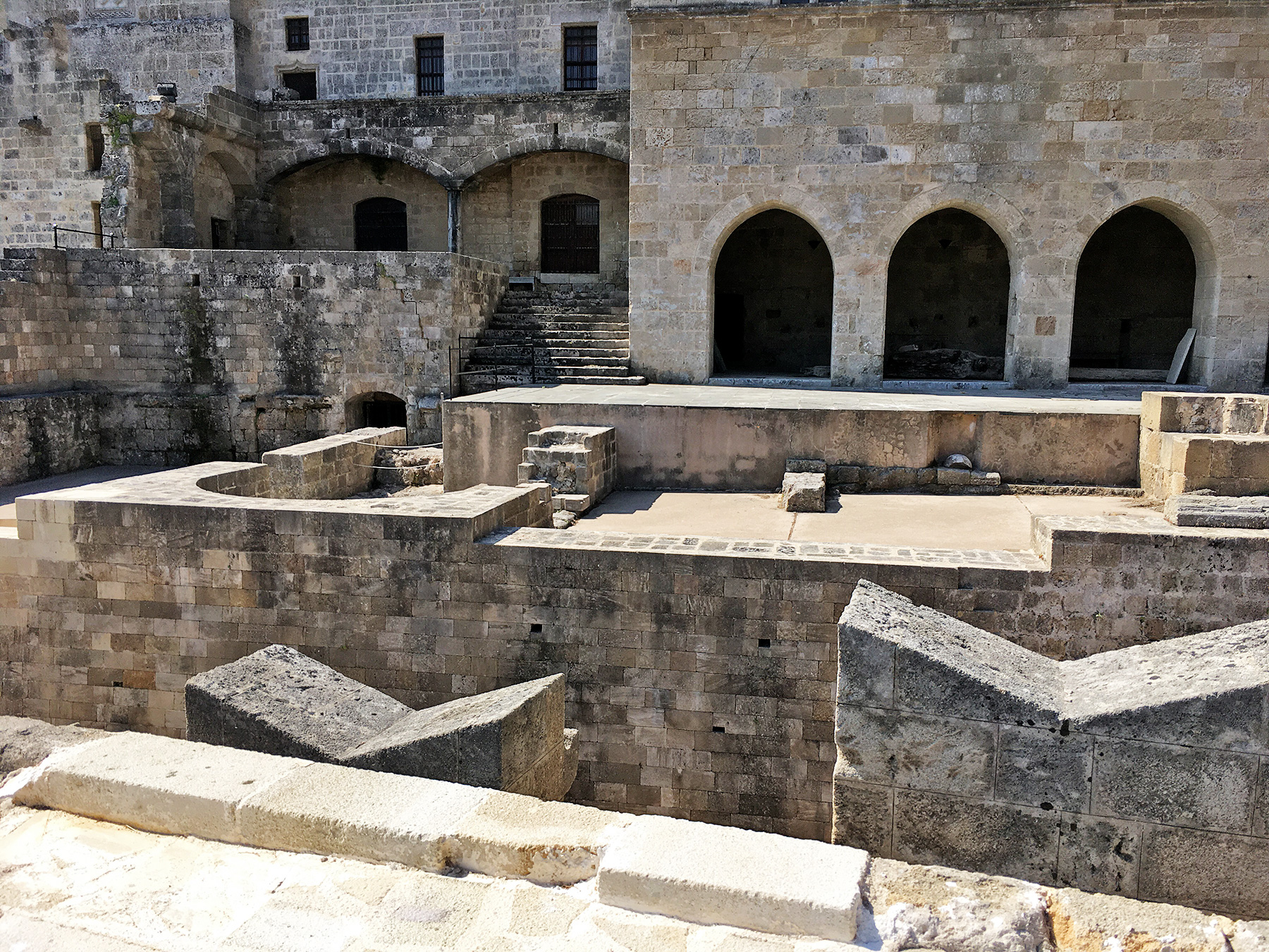 The massive medieval strongpoint is located to the north of the Palace, across a narrow ditch. Its large-caliber cannon covered the northern part of the town wall and the harbour of Mandraki. In the recent restoration most of the east face of the bastion, partially collapsed, was restored from the foundation up with its covered battery and basements, while the hitherto buried remains of part of the north wing of the Palace were uncovered and enhanced.
