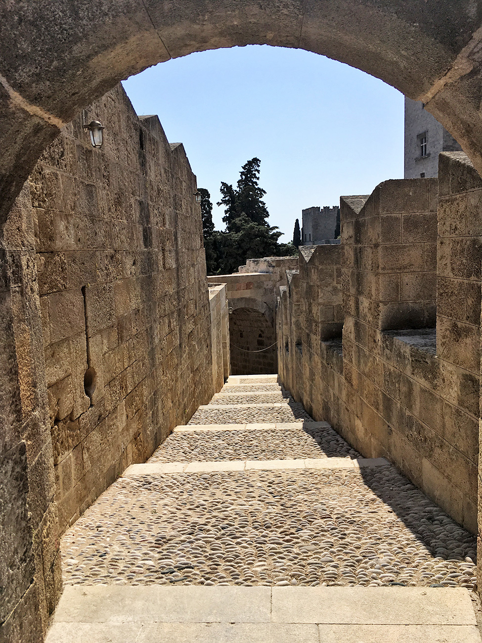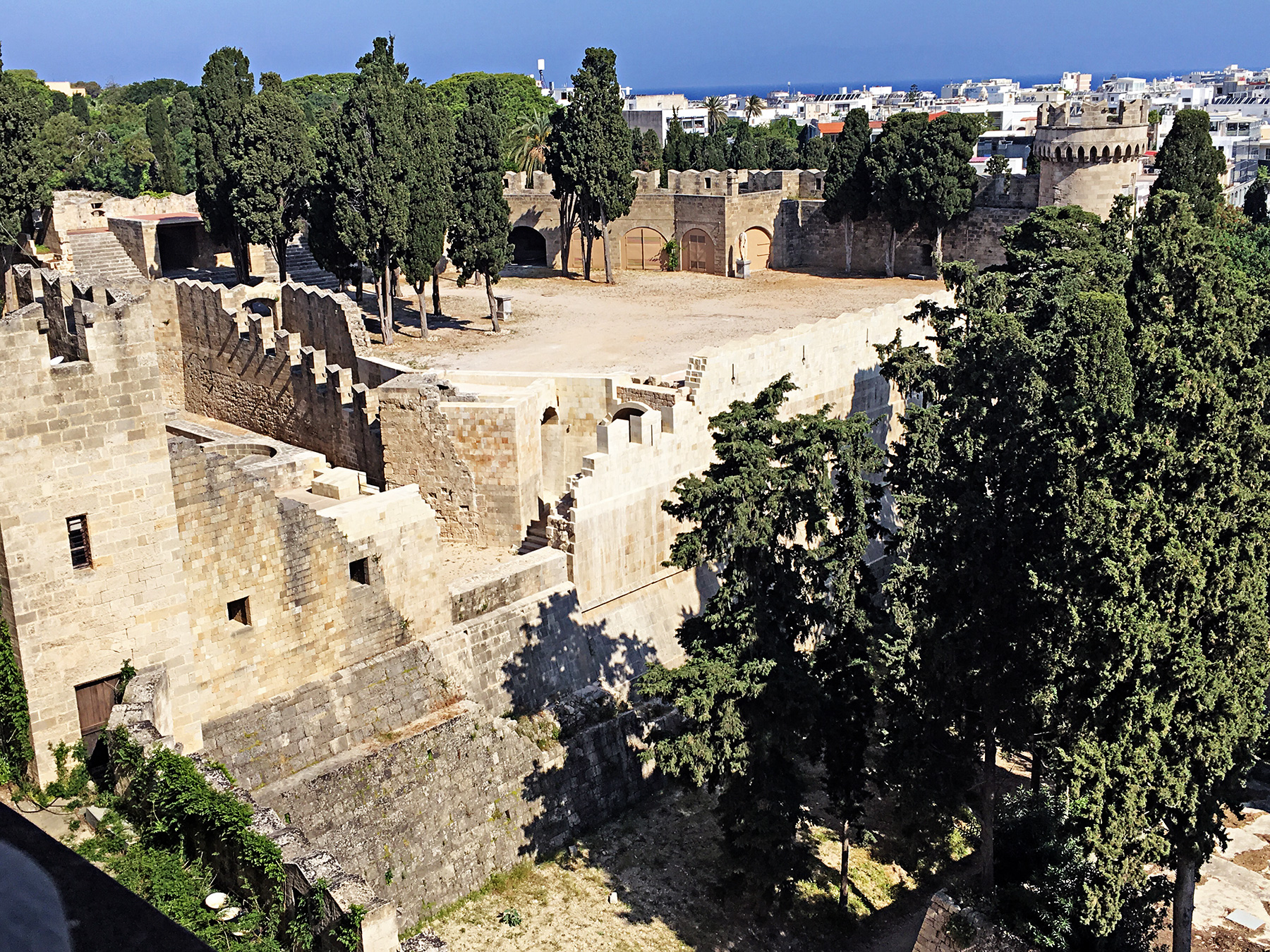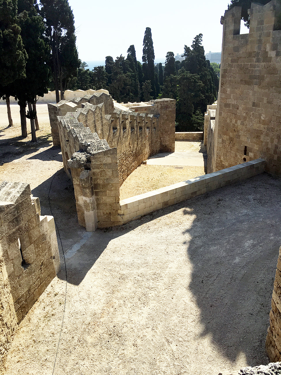 The massive medieval strongpoint is located to the north of the Palace, across a narrow ditch. Its large-caliber cannon covered the northern part of the town wall and the harbour of Mandraki. In the recent restoration most of the east face of the bastion, partially collapsed, was restored from the foundation up with its covered battery and basements, while the hitherto buried remains of part of the north wing of the Palace were uncovered and enhanced.
