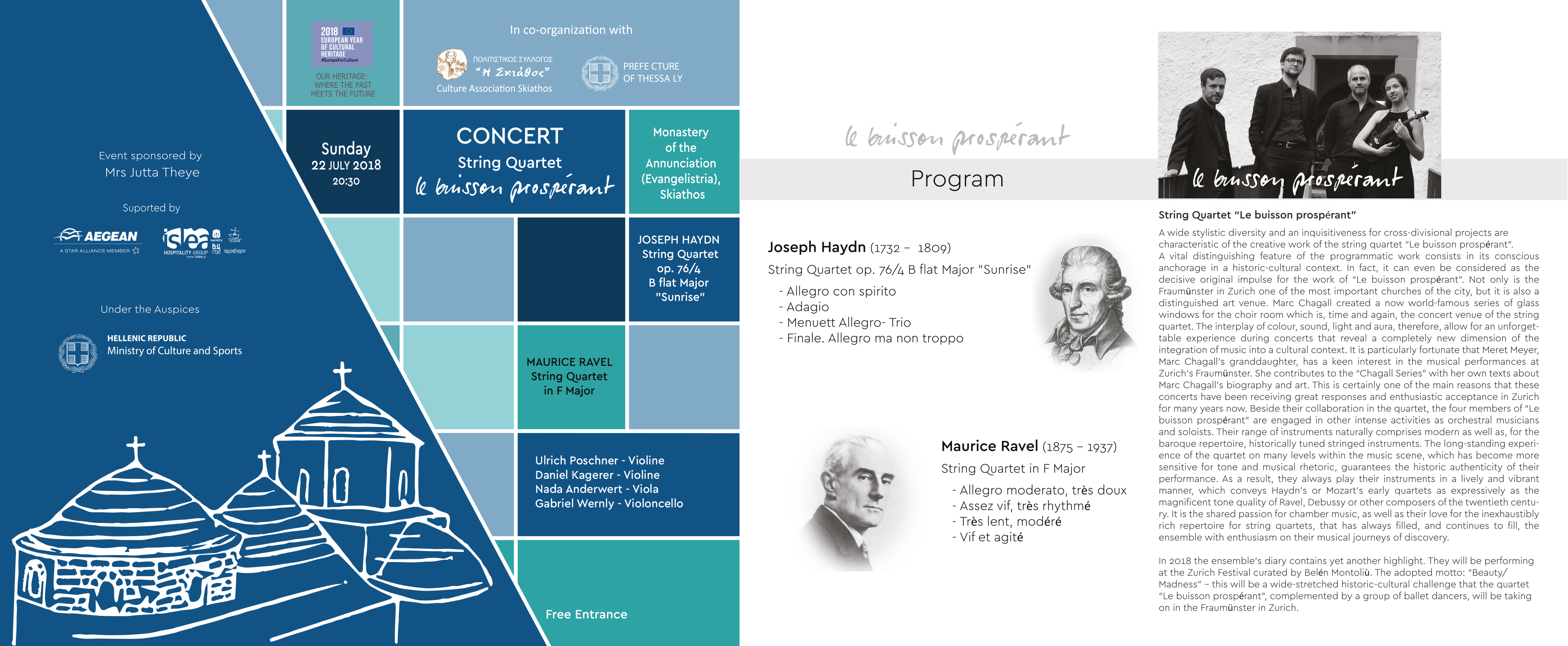 The Cultural Association "Skiathos" organises a  string quartet by the "Le buisson prospérant", with the renowned musicians, Gabriel Werny, Ulirch Poschner, Nada Anderwert και Daniel Kagerer, members of the The Philharmonia Zurich the Lucerne Symphony Orchestra and the Camerata Bern.