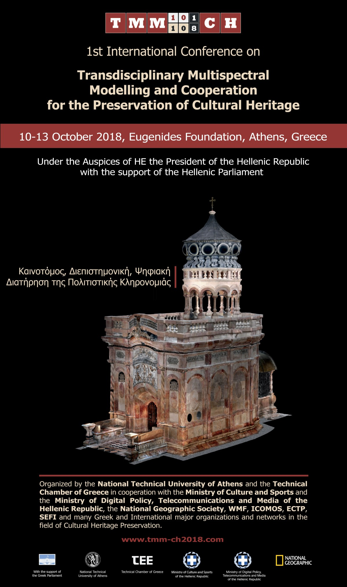 The National Technical University of Athens and the Technical Chamber of Greece, with the Collaboration of the Ministry of Culture and Sports and the Ministry of Digital Policy, Telecommunications and Media of the Hellenic Republic, organize the 1st International Conference on Transdisciplinary multispectral modeling and cooperation for the preservation of cultural heritage (TMM_CH)", on October 10-13, 2018 in Athens Greece.