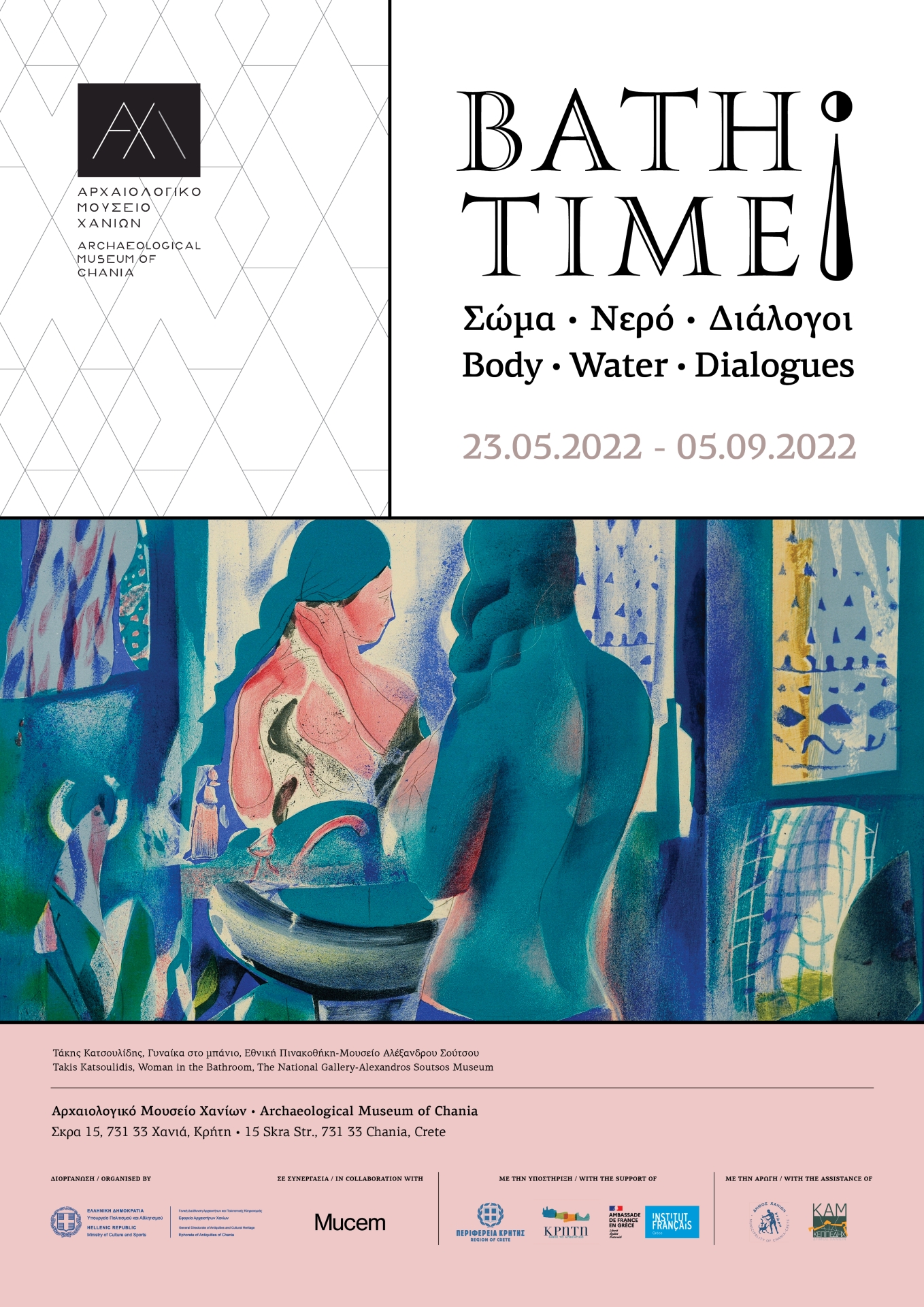 The exhibition is realised based on the idea of and in partnership with the Musee des civilisations de l’Europe et de la Mediterranee (MuCEM | Marseilles). Through 137 ancient, medieval and contemporary objects and artworks – from the collections of the Archaeological Museum of Chania and the MuCEM, as well as other museums and collections in Greece and France – an original historical and artistic osmosis is attempted, engaging in a constant dialogue with the various aspects of bathing practices through time, a vital element of Mediterranean cultures.